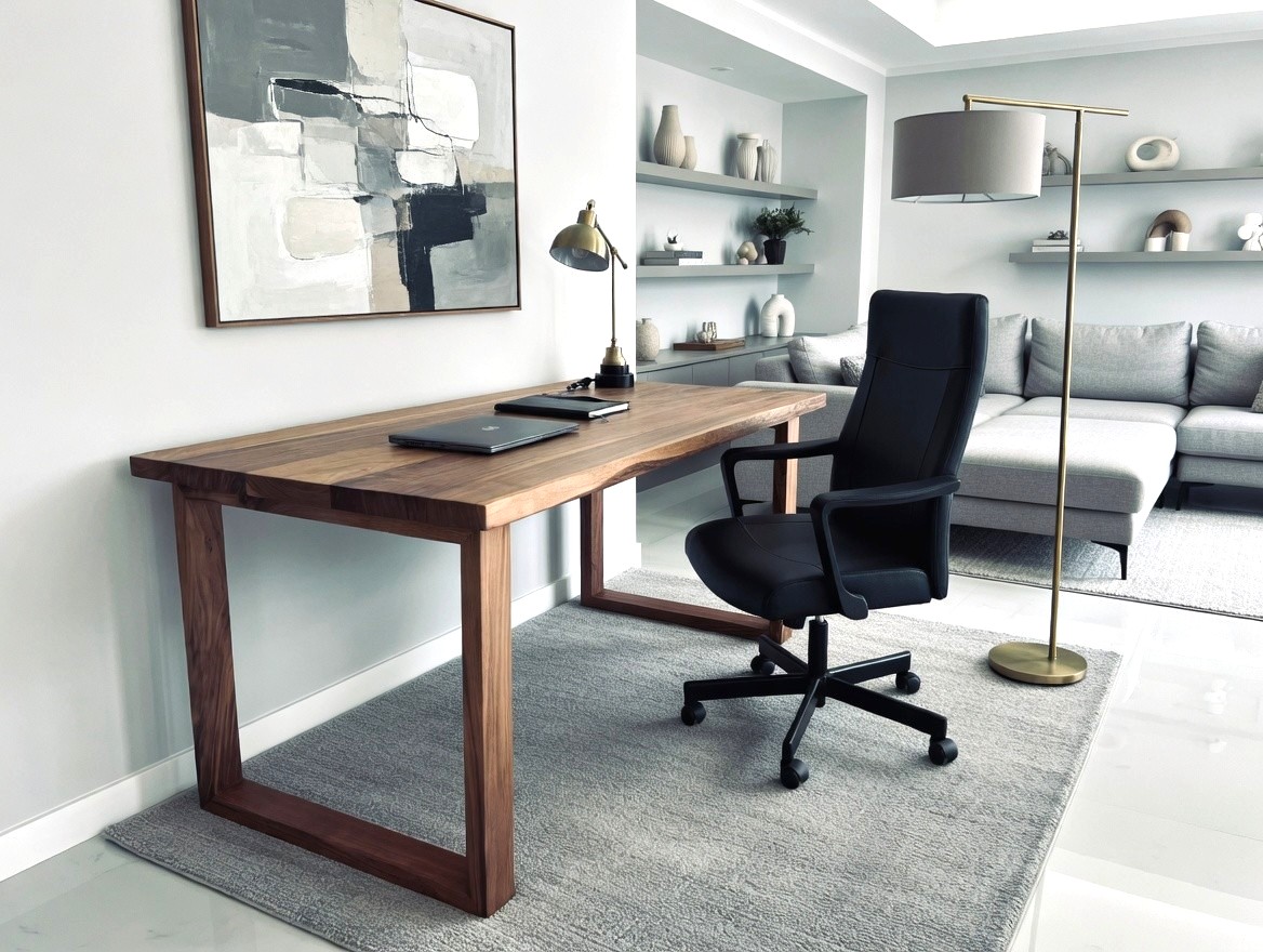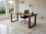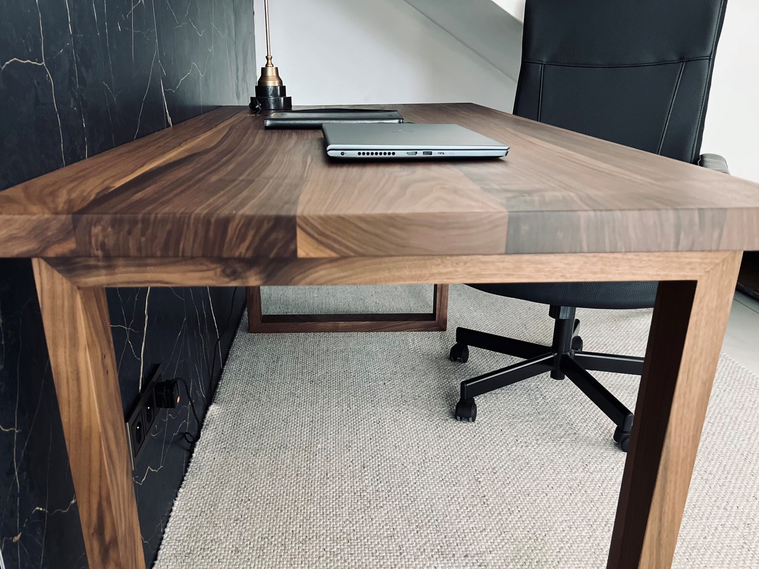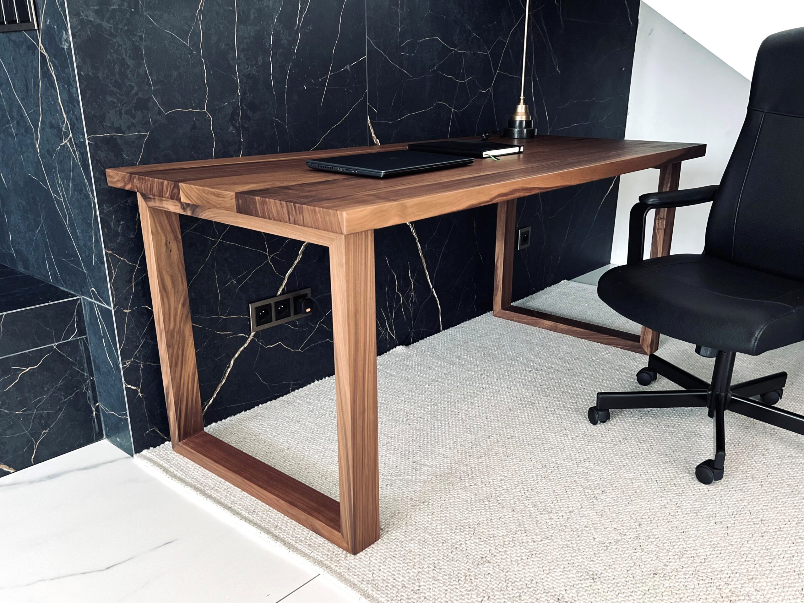Mocne, masywne biurko wykonane w całości z litego orzecha amerykańskiego. Konstrukcja oparta na masywnych nogach zapewnia stabilność, a gruby, 4-centymetrowy gwarantuje wytrzymałość i komfort użytkowania. Biurko to łączy w sobie klasyczne piękno drewna z nowoczesną formą