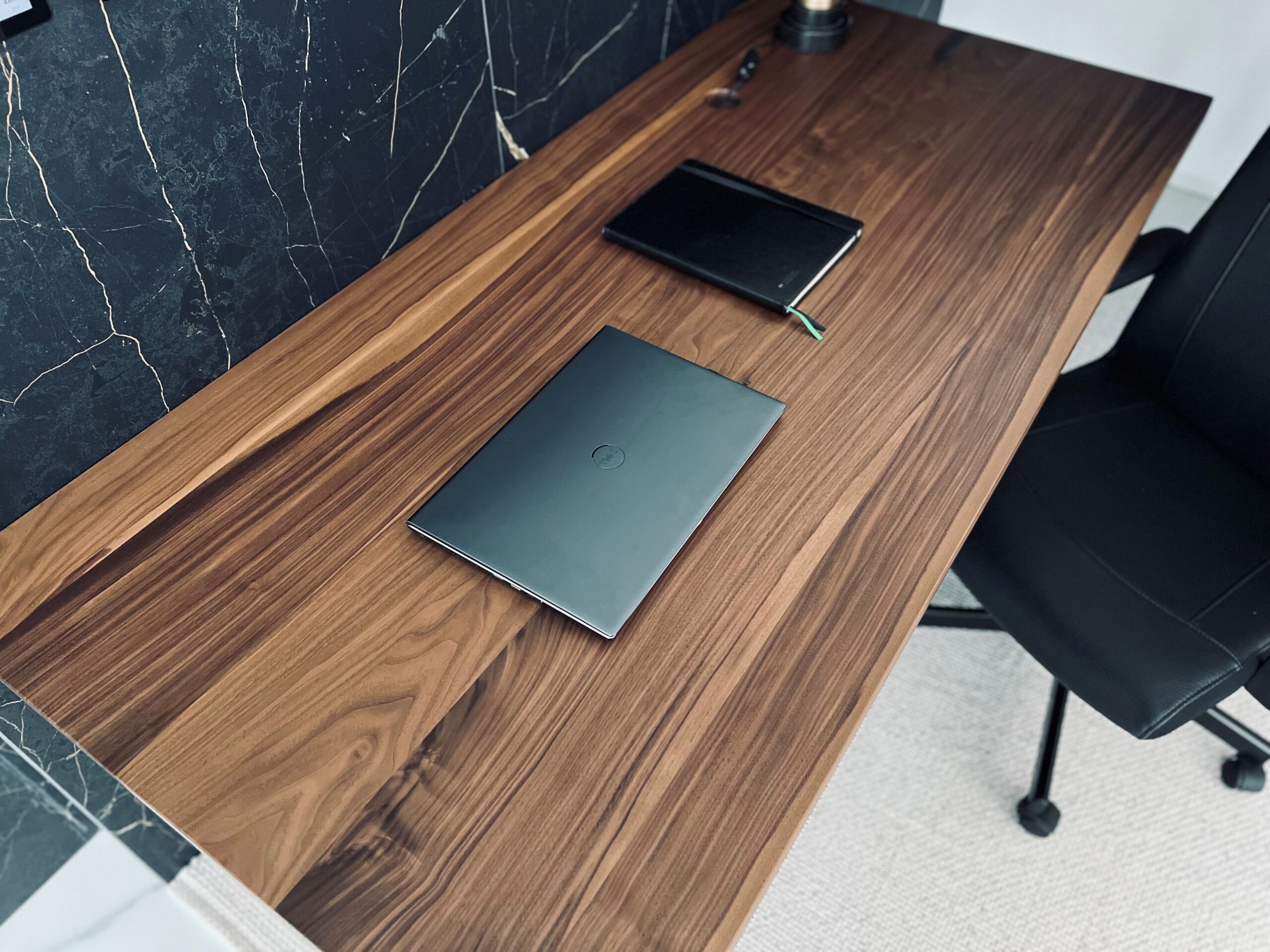 – Materiał: biurko w całości wykonane z litego orzecha amerykańskiego klasy A. Drewno charakteryzuje się jednolitą strukturą i brakiem wad. Dopuszczalne są drobne, pojedyncze sęki wypełnione czarną masą, podkreślające naturalny charakter mebla