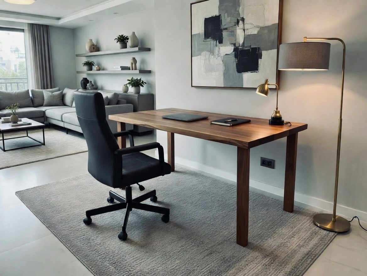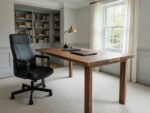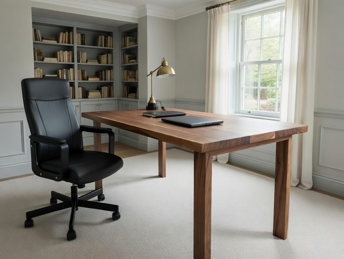 – Materiał: biurko w całości wykonane z litego orzecha amerykańskiego klasy A. Drewno charakteryzuje się jednolitą strukturą i brakiem wad. Dopuszczalne są drobne, pojedyncze sęki wypełnione czarną masą, podkreślające naturalny charakter mebla