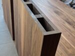 W naszej pracowni tworzymy najwyższej jakości blaty klejone z orzecha amerykańskiego klasy A. Wykorzystujemy wyłącznie starannie wyselekcjonowane drewno i długie lamele o długości całego blatu. Kleimy je tylko po szerokości – każda lamela ma 8–25 cm szerokości, dzięki czemu mebel zyskuje piękny, naturalny wygląd i zdecydowanie wyróżnia się na tle produktów z drobnych fragmentów drewna