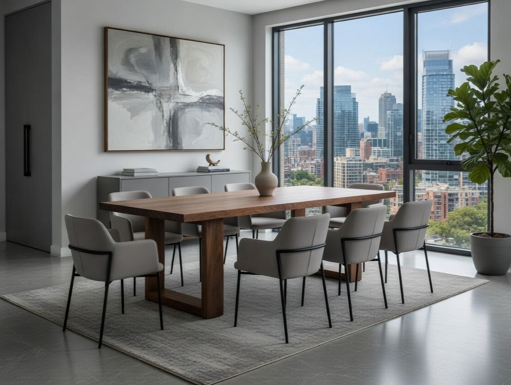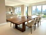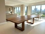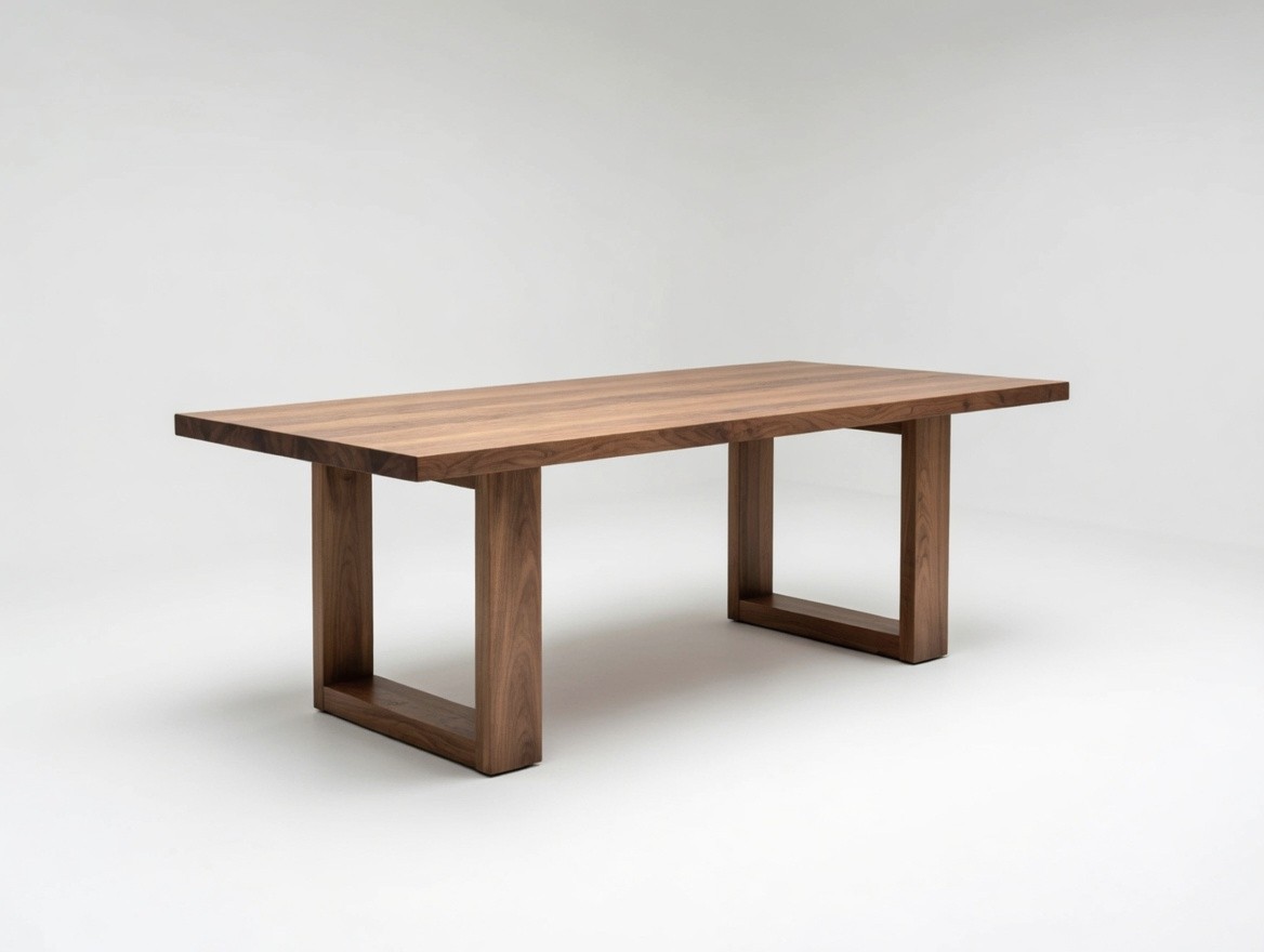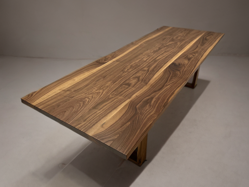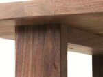 – Materiał: stół w całości wykonany z litego orzecha amerykańskiego klasy A. Drewno charakteryzuje się jednolitą strukturą i brakiem wad. Dopuszczalne są drobne, pojedyncze sęki wypełnione czarną masą, podkreślające naturalny charakter mebla
