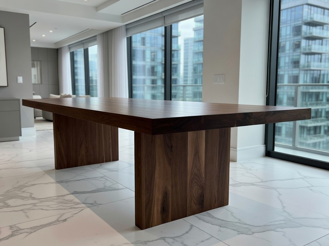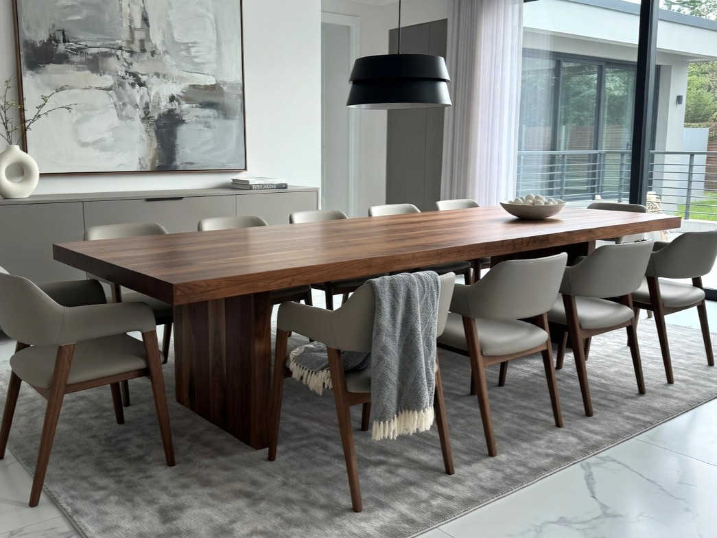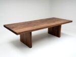 – Materiał: stół w całości wykonany z litego orzecha amerykańskiego klasy A. Drewno charakteryzuje się jednolitą strukturą i brakiem wad. Dopuszczalne są drobne, pojedyncze sęki wypełnione czarną masą, podkreślające naturalny charakter mebla