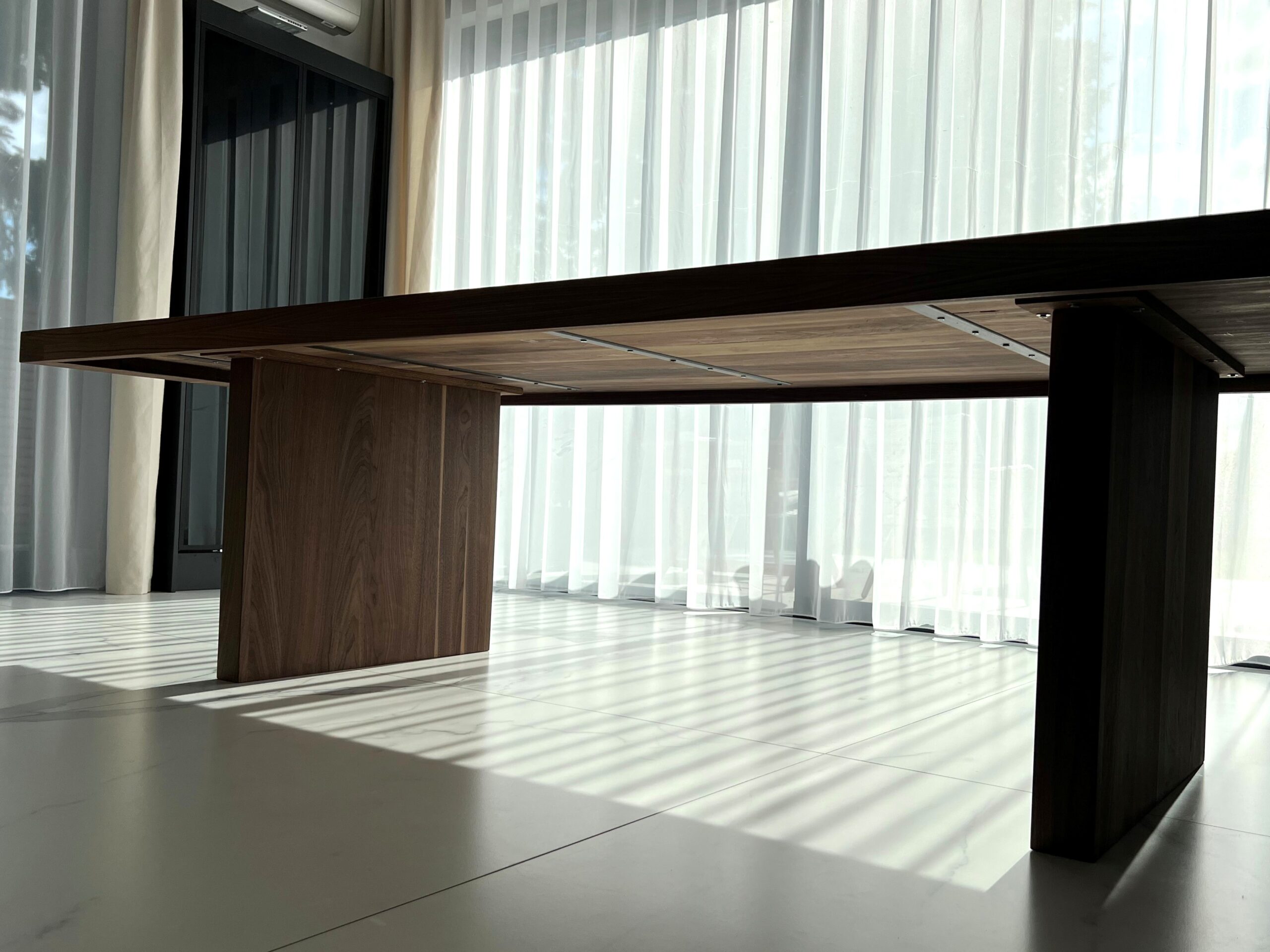 – Nogi zbudowane z klejonki orzecha amerykańskiego o grubości 2 cm. Szerokość nogi – 60 cm. Grubość nogi – 8 cm