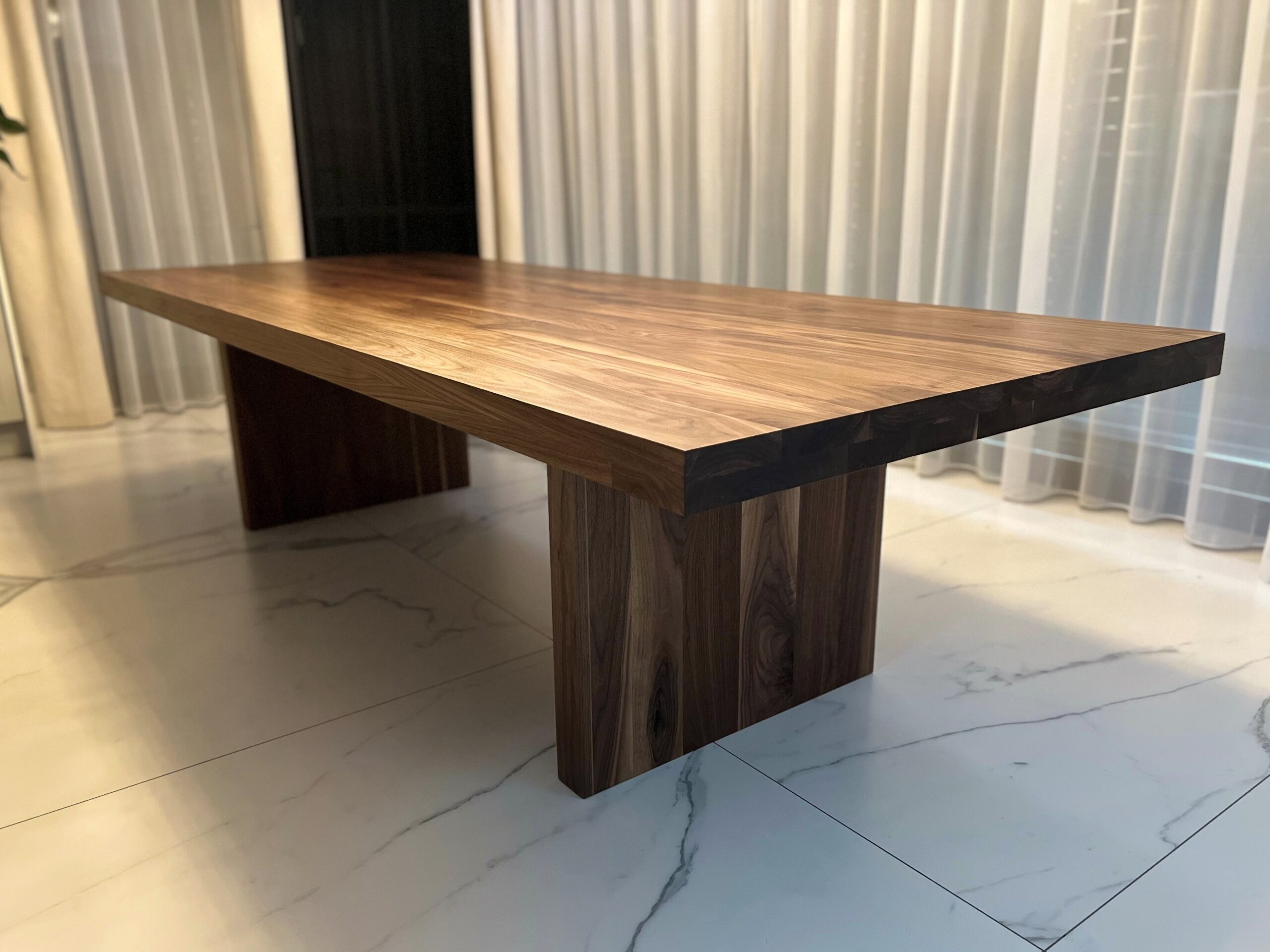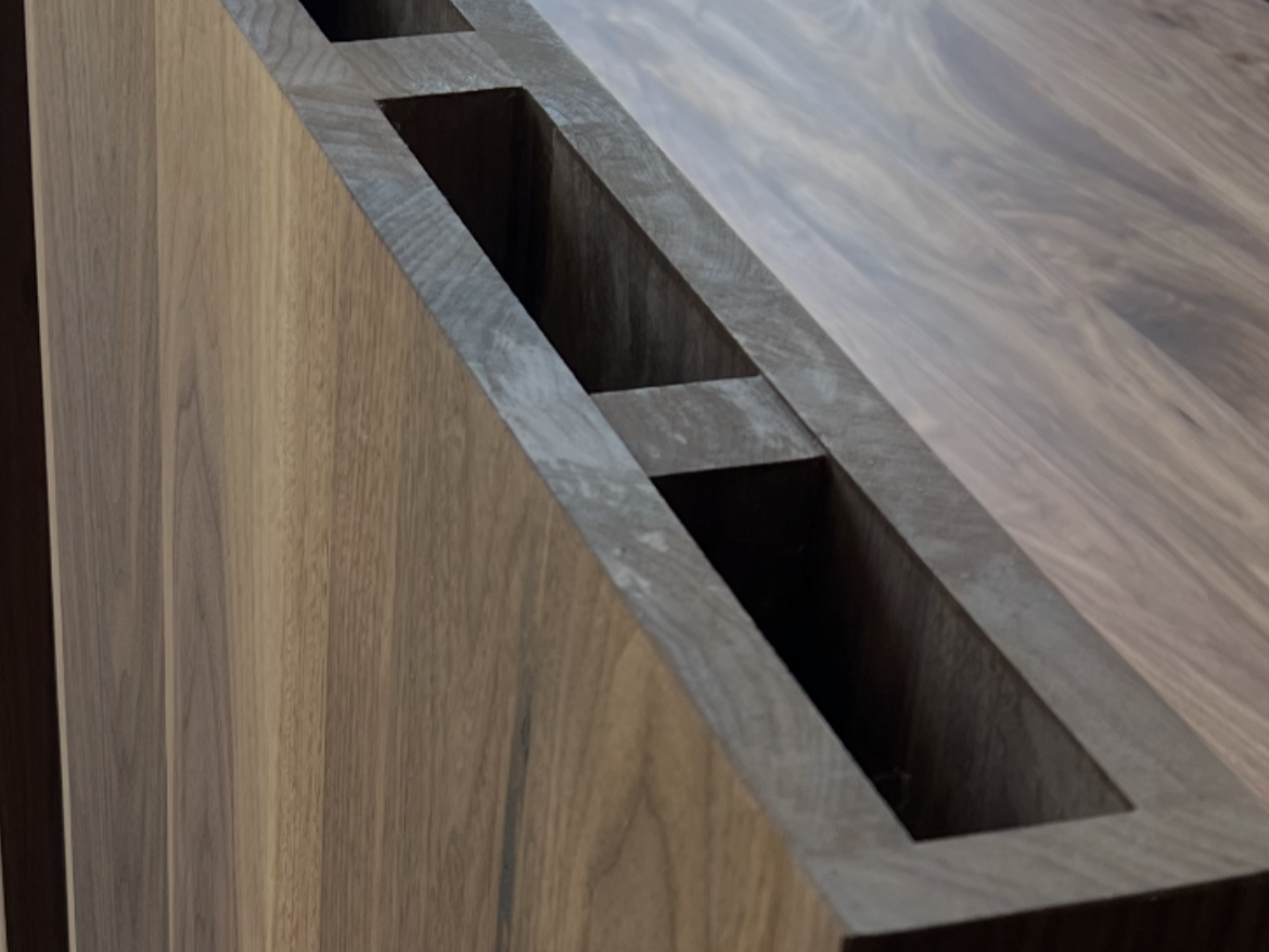 W naszej pracowni tworzymy najwyższej jakości blaty klejone z orzecha amerykańskiego klasy A. Wykorzystujemy wyłącznie starannie wyselekcjonowane drewno i długie lamele o długości całego blatu. Kleimy je tylko po szerokości – każda lamela ma 8–25 cm szerokości, dzięki czemu mebel zyskuje piękny, naturalny wygląd i zdecydowanie wyróżnia się na tle produktów z drobnych fragmentów drewna