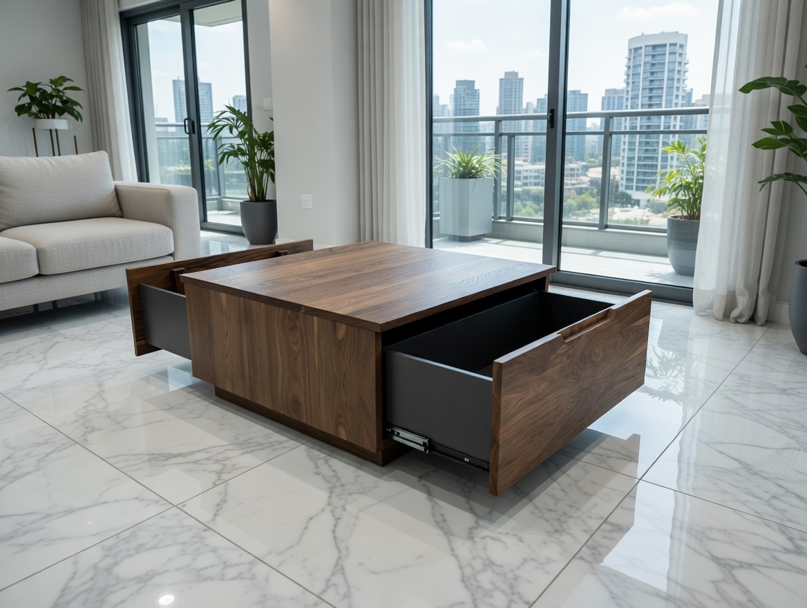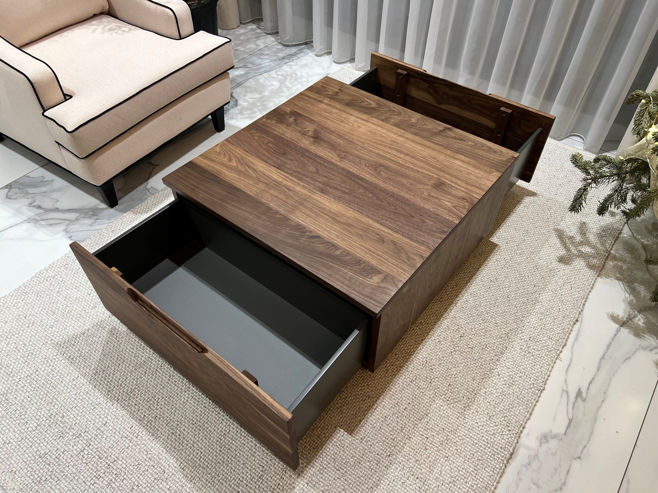 Stolik kawowy z dwiema szufladami. Precyzyjne wykonanie oraz ponadczasowy design. Każdy egzemplarz wykonywany jest z najwyższej klasy materiałów, dzięki czemu stolik stanowi zarówno funkcjonalny mebel, jak i wyjątkową ozdobę wnętrza
