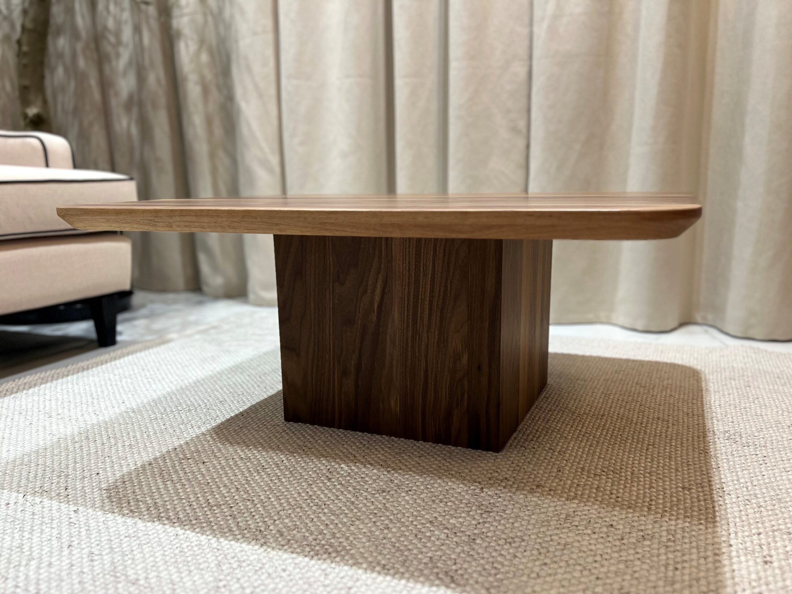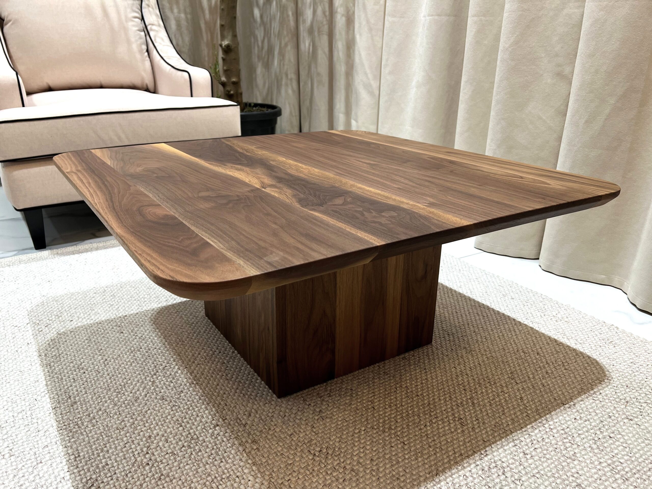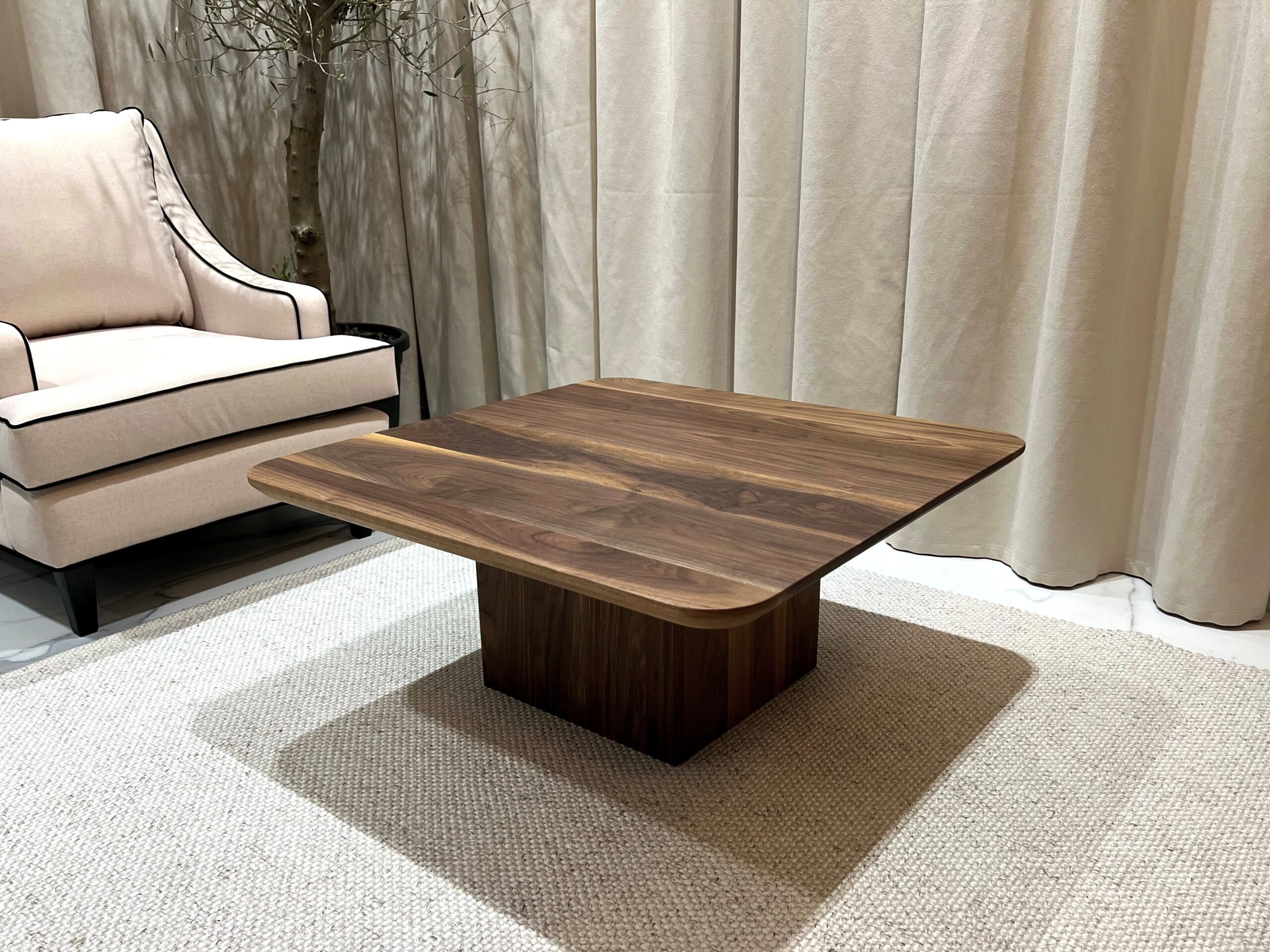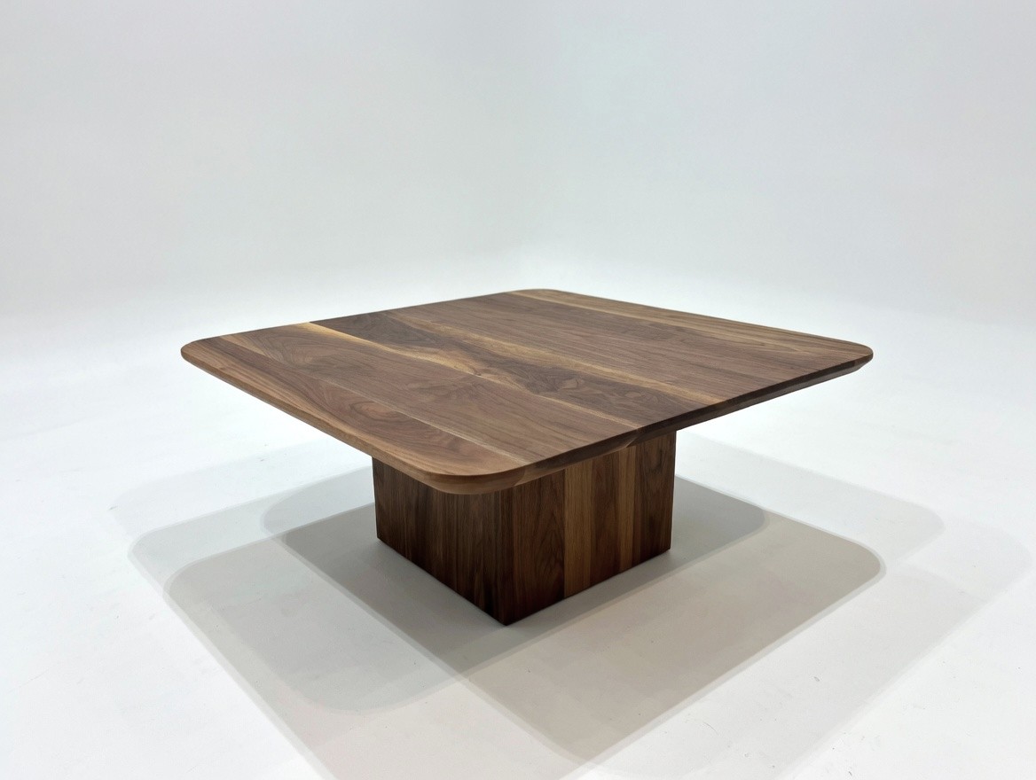– Materiał: stolik w całości wykonany z litego orzecha amerykańskiego klasy A. Drewno charakteryzuje się jednolitą strukturą i brakiem wad. Dopuszczalne są drobne, pojedyncze sęki wypełnione czarną masą, podkreślające naturalny charakter mebla