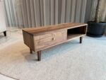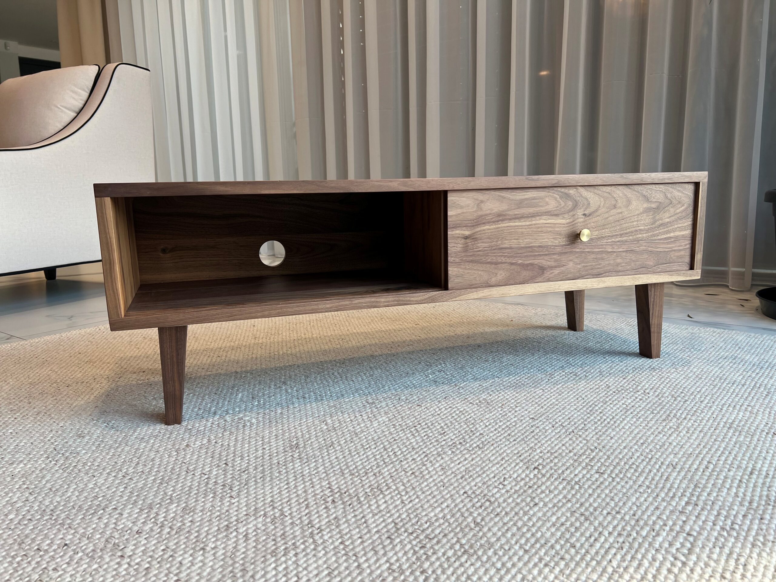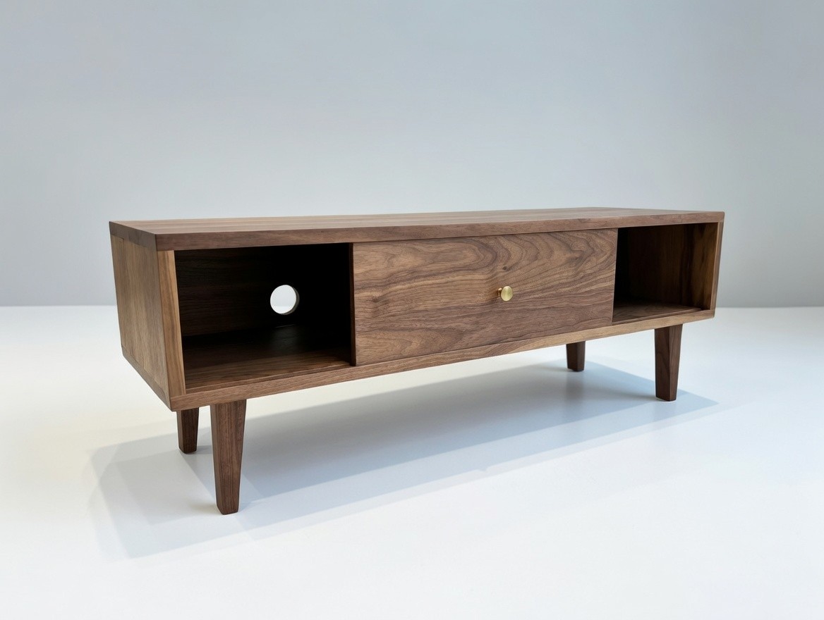 Szafka AKOS zbudowana z całości z litego orzecha amerykańskiego. Posiada jedne drzwiczki przesuwne, więc Ty wybierasz która strona szafki będzie zamknięta. W jednej i drugiej wnęce znajduje się otwór na kable ( Fi 60 mm ). Drzwi można w każdej chwili, bardzo łatwo wyciągnąć i włożyć z powrotem